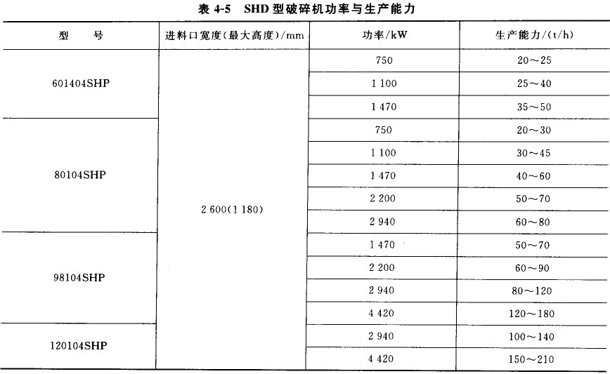立式破碎機世界上使用較少,90%以上的用廣都選用臥式。亨息爾公司的臥式破碎機與美國紐維爾公司的產品相似,這里不再贅述,其功率與作產能力見表4-7。