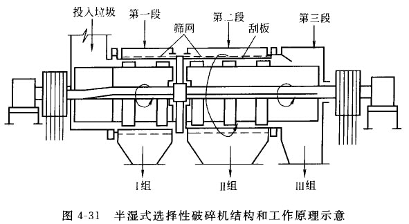 圖4-31是半濕式選擇性破碎機(jī)結(jié)構(gòu)和上作原理示意。
