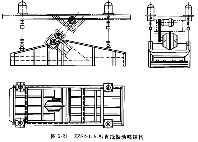 ZZS型直線振動篩也是一種吊掛式振動篩,有ZZDS2-1.5型和ZZS1-1.8型兩種,前者為雙層篩面,后者為單層篩面。這種篩分機結構簡單,工作可靠。