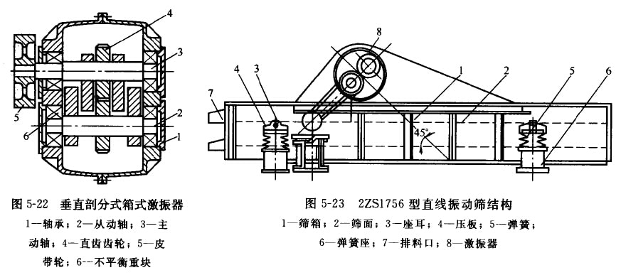 DS系列直線振動篩采用整體的箱式激振器(見圖5-20)。激振器的箱體用35號鑄俐制成。箱體內槳有主動軸1和從動軸2,軸上各有一對重 量相向的不平衡員塊(偏心塊)3,皮帶輪4帶動土軸問轉,通過一對齒輪5使從動軸做反向心同歲的回轉,利用個平衡玉回轉時產生的離 心力使激振器產牛定向的激扼力。該激振器具有以下結構特點。①平衡重塊成對地布量在激銀器箱體外面。這樣可使箱內結構緊湊;便 于調整不平衡重塊上面的配重柱塞,以改變篩稻的振幅;同時,也避免不平衡重塊回轉時,碰擊箱體內的潤滑油而引起箱體發熱。齒輪 對安裝在箱體內,使其潤滑可靠,傳動平穩。②制成整體式,沒有別分面,在承受激振力時較合理,制造簡單,但拆裝困難。
