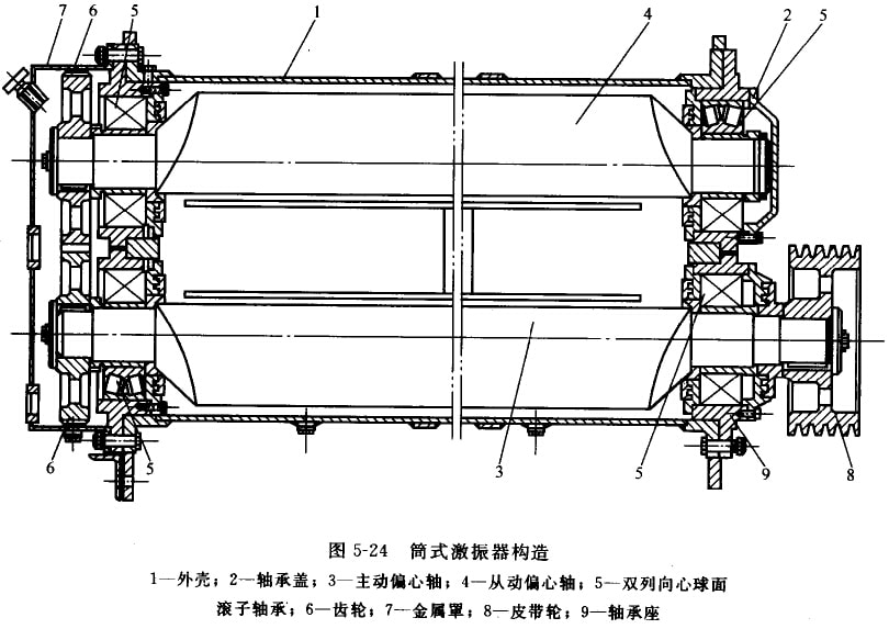 座式直線振動篩采用筒式激振器,其構造如圖5-24所示。在帶三角形側板的扁圓筒形外殼1上裝有軸承座9,兩根偏心軸3、4通過一對雙列向心球面滾子軸承5安裝在軸承座上。皮帶輪8帶動主動偏心軸3并經一對齒輪6使從動偏心軸4做反向同步回轉,從而產生定向的激振力。在一對齒輪6一側有金屬罩7,內裝潤滑油,用以潤滑齒輪和同側的該動軸承。皮帶輪側的軸承各成封閉油腔,采用潤滑脂潤滑。齒輪側的波動軸承和皮帶輪側的滾動軸承采用迷宮式密封。激振器通過螺栓固定在篩箱上,并用鉸孔螺栓定位。
