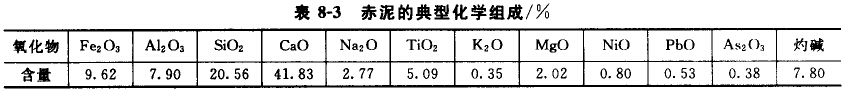 赤泥是制鋁工業(yè)從鋁上礦中提煉氧化鋁后殘留的一種紅色、粉泥狀、高含水量的強(qiáng)堿性固體廢料,密度0.7-1.0t/m3,比表面積0.5-0.8m2/g。赤泥的組成和性質(zhì)復(fù)雜,并隨礦石成分、氧化鋁生產(chǎn)工藝,及赤泥的脫水、陳化程度有所變化,其典型化學(xué)成分如表8-3所示。