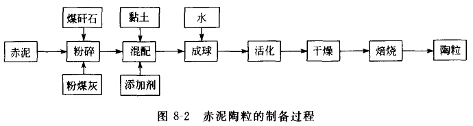 赤泥在建材工業(yè)中的其他用途還有:制備赤泥陶粒(工藝流程如圖8-2所示)、生產(chǎn)玻璃、流態(tài)自硬砂硬化劑,用作塑料填充劑、防滲材料、鋪路等,日前已有部分投人生產(chǎn)運(yùn)營。但赤泥的使用量仍很低,這是由于赤泥中臺有大量堿液,有的赤泥中尚含有U、Th、Sc、La、Y、Ta、Nb等放射性元素和稀有金后,如長期身處這類建材中,將直接危害人體健康。