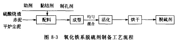 拜爾法赤泥中含有赤鐵礦(α—Fe2O3)和針鐵礦(α—FeOOH)、一水硬鋁石(Al203·H2O)、含水硅鋁酸鈉(Na2O·Al2O3·1.73SiO2·1.73H2O)、方解石(CaCO2)等物相,經(jīng)熱處理后可形成多孔結(jié)構(gòu),比表面積可達(dá)40-70m2/g,因此,在硫化氫廢氣污染治理上,可利用其較佳的吸附性能,和硫酸燒渣、平爐塵等一道為主要原料(含員78%-88%)制備廉價(jià)的氧化系脫硫劑,其工藝流程如圖8-3所示。