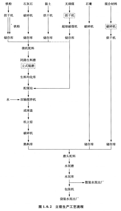 水泥生產工藝流程有干法回轉窯生產工藝流程、濕法回轉窯生產工藝流程和立窯生產工藝流程等。于法回轉窯生產工藝流程見圖1.0.1,立窯生產丁藝流程見圖1.0.2。