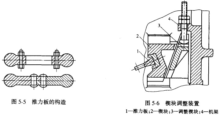 (2)墊片調整裝置。如圖5-7所示,在后推力板1的支承座2后面放入一組厚度相同的墊片3,改變墊片的數量,即可達到調整徘礦口大小的目的。在調整排礦口時,要先特螺帽4及拉桿彈簧螺帽5松開,然后增加或減少墊片的數目,待排礦口調整好后,再將螺帽4上緊,并調整彈簧上的螺帽5。用此法可以達到多級調整,調整時也比較方便,同時可以使機器結構緊湊和質量減小。但調整時必須停車。這種方法常用在大、中型碎礦機上。