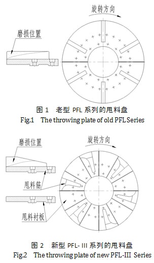 老型PFL的甩料盤結構如圖1所示:由于甩料盤的筋靠近圓周邊緣的切線速度比內側要高、磨損要快,材料利用率很低(不足10%),甩料盤筋的形狀和磨損位置如圖1所示。