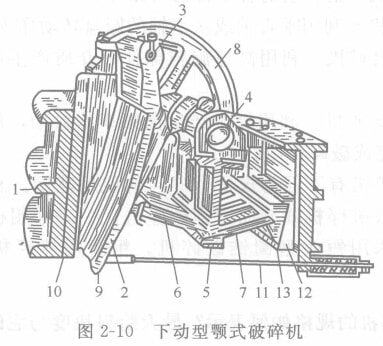 下動型顎式破碎機在選礦廠用得最多。其結(jié)構(gòu)如下圖所示。