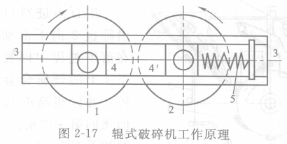 下圖為輥式破碎機的結構及工作原理。輥1安裝在機架3上的固定軸承4上,輥2則被可動軸承4所支持。兩個輥子分別用兩個電動機帶動,并作相向轉動。礦石出上部給入,破碎是在兩個輥子間形成的空隙中進行的。金屬礦山由于多使用光滑輥面,所以破碎作用主要是靠壓碎,計附帶有些研磨作用(當為齒面時則上要靠劈碎作用)。破碎后的物料借重力自行排出。這種破碎機的特點是由于物料通過兩個輥子中間時只受壓一次,所以過粉碎現象少。