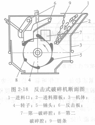 反擊式破碎機是一種高效的新型破碎設備。下圖為反擊式破碎機的斷面圖。