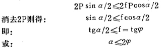 如圖1所示,當礦塊被動顎以P的壓力壓在固定顎板上,則固定顎板的反作用壓力為P1。P和P1除對礦石有破碎作用外,還在礦塊與兩顎板接觸點上引起摩擦力fP和fP1,P力可以分解為水平分力(即破碎礦石的力)和垂直分力(即使礦石向上跳動之力),此垂直分力為Psina。fP也可以分解為水平分力 (即破碎礦石的力)和垂直分力(使礦石向下之力),此垂直分力為fpcosa。而P1的大小為Pcosa和fpsina兩分力之和(因P1為此兩分力的反作用力)因而P1所產生的摩擦力為:f(Pcosа+ fpsina)。要使礦石在破碎腔中不致向上跳動,必須: