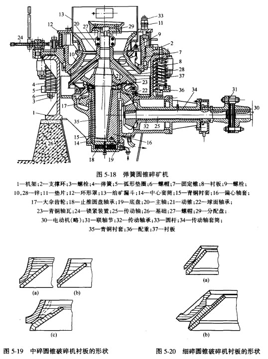 彈簧圓錐碎礦機的構造,如圖5-18所示。破碎機機架l的上部裝有支撐環2,支撐環與機架用長螺栓3和彈簧4連接起來,螺栓的栓頭在支撐環的法蘭盤上,螺栓的下端穿過弧形墊圈5上的孔,然后用螺帽6扣緊。固定錐7的外表面用螺紋與支撐環內表面旋接在一起。固定錐的內表面鑲有錳鋼制造的襯板8。襯板與固定錐之間澆鑄一層鋅10,以保證錐體與襯板結合緊密。在固定錐的上面蓋有環形罩12,用圓桿33與固定錐連在一起,并用楔鐵緊壓,給礦漏斗13固定在環形罩上。