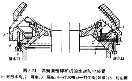 為了防止灰少進入球面軸承和傳動機構,破碎機設有防塵裝置,如圖5-21所示。在球面軸承的外緣有一環形水溝1,水在壓力作用下,沿水管進入閑空2,然后通過隔板3上的許多小孔進入環形水溝,并保持一定的高度,多余的水則從環形水溝攫至環形排水槽4的排水管流出。在動錐下部邊緣上有碗形擋塵圈5(亦稱領緣),碗形擋塵困的自由端插在環形水溝中,用它將灰塵擋入水中并隨水排出,在排水溝的外側還裝有一層橡皮防塵田6,它與動錐下部碗形擋塵困的外側相接觸,由于防塵圈是橡膠的,所以動錐無論如何擺動,此防塵團始終與碗形擋塵團接觸,這樣可將大部分粉塵隔除,起到了第一道防塵作用,減輕了水封防塵的負擔,從而更保證了設備的安全運轉。