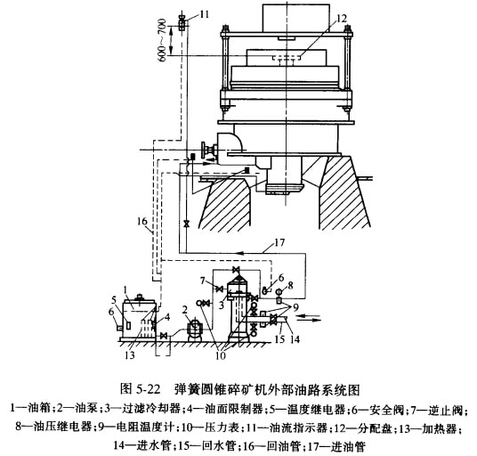 碎礦機的潤滑,是采用循環液體油集中潤滑,油通過油泵從機架下中心套簡14側壁上的油孔進入偏心軸套的止推團盤中。由于圓盤上有放射狀油溝,故圓盤得以潤滑,然后由此處分為三路上升。一路沿青銅襯套與偏心軸套間的間隙上升嚴路從偏心軸套與主袖間的間隙上升;一路沿主軸的中心圓孔上升,流至動錐底部球面與球面青銅軸瓦問的間隙中。并潤滑這些摩擦面。然后這三路油匯合在一起,流經大小傘齒輪并潤滑之。最后順流而下至排油管排出,流回原油箱中。潤滑汕不僅起到潤滑作用,而且帶走了各摩擦面產生的熱量,所以在油流回油箱前要經過冷卻裝置,使油冷卻后再回至油箱中。水平傳動軸與軸承的潤滑是單獨的油路系統。調整環和支撐環上的梯形調整螺紋,是從支撐環側壁上的注油孔向螺紋注入黃干油來潤滑的。圖5-22是彈簧圓錐碎礦機外部油路系統圖。