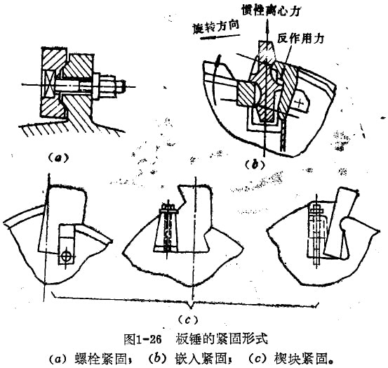 2.嵌入緊固法:扳錘從轉子側面軸向插入轉子的相應槽孔內,為了防止軸向竄動,兩端采用壓板定位如圖1-26(5)。這種緊固方式利用板錘回轉時產生的離心慣性力與撞擊破碎時的反力自鎖緊固,易磨損件又便于更換。