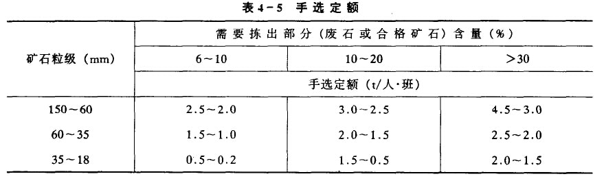 根據江西、廣東、湖南等省選礦廠的生產實踐統計,皮石選出率為35%一7D%,手選工效約3t/人·班,手選回收率為96.5%一99.0%。手選定額如表4—5所示。