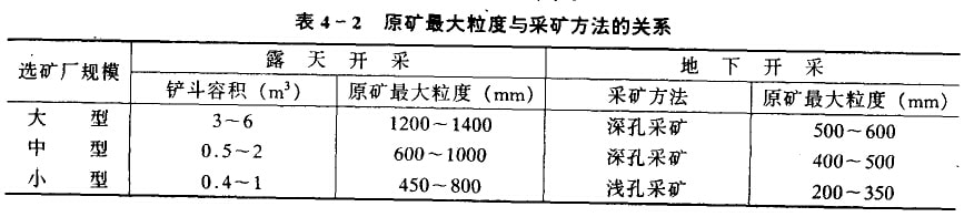 原礦最大耗度的確定:原礦最大粒度與采礦有關,即與礦床賦存條件、礦山規模、采礦方法、裝運設備等有關。它們之間的關系,如表4—2所示。