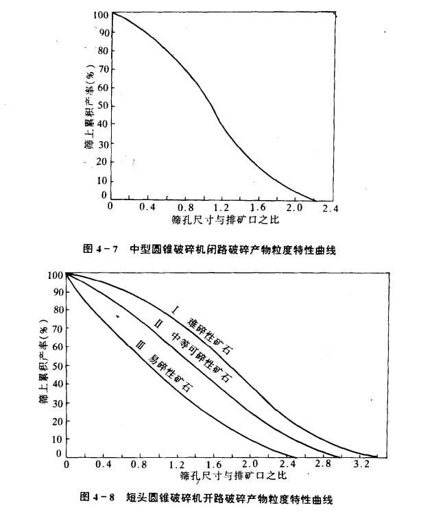 從表4—4可以看出,各種類型的破碎機的排礦產物中都有過大顆粒,而且過大顆粒的含量很高.如短頭圓錐破碎機破碎中等可碎性礦石時,排礦產物中過大顆粒含量高達60%,最大粒度為排礦口寬度的2.2—2.7倍;破碎難碎礦石時更為嚴重,B=75%,Zmm=2.9—3.0。