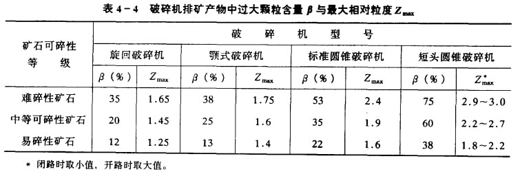 所謂檢查篩分是與破碎機(主要是細碎機)構成閉路的篩分作業。各種類型破碎帆不管是開路破碎,還是閉路破碎,其排礦產物中都含有小于排礦口寬度的產物和大于排礦口寬度的產物(或稱過大顆粒),如圖4—8,圖4—9所示。小于排礦口寬度的產物,設置預先篩分是有利的,大于徘礦口寬度的產物,設置檢查篩分是必要的。破碎機排礦產物中最大粒度與排礦口寬度之比,稱為最大相對粒度。同理.排礦產物中某一粒度(對應于某一篩孔尺寸)與排礦口寬度之比,稱為某一相對粒度Z。排礦產物中,大于誹礦口寬度的過大顆粒含量與最大相對粒度,如表4—4所示。