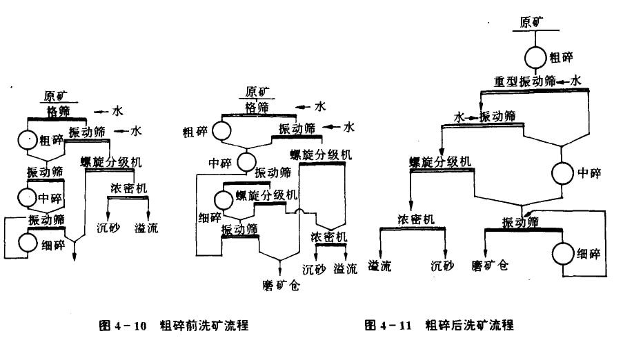 洗礦的典型流程,如圖4—Io,圖4—ll所示。洗礦后的礦泥有單獨處理和礦砂、礦泥合并處理兩種方案,采用哪種方案,視礦泥和礦砂的性質而定。