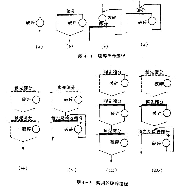 破碎流程類型 破碎流程的基本作業是破碎和篩分兩個作業。篩分作業有預先篩分和檢查篩分。破碎流程中,有時有洗礦作業。據此,組成破碎流程的可能單元流程有以下(a),(b),(c),(d)四種,如圖4—1所示:以此單元流程可組合成各種破碎流程類型。如兩段破碎流程可能的類型總數為4×4=l6種、三段破碎流程可能的類型總數為4×4×4=64種。