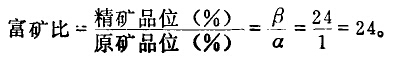 精礦品位(β)和原礦品位(α)之比叫富礦比。這個比值表示精礦中和用成分的含量比在原礦中有用成分的含量提高的倍數(shù)。如硫化銅礦,原礦中銅品位為1%,精礦中銅品位為24%,其富礦比為: