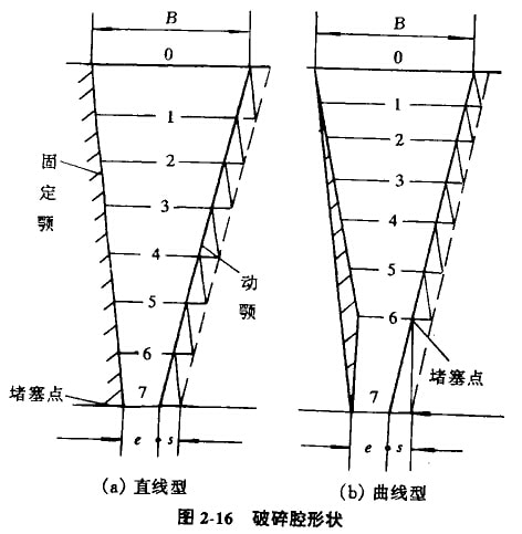 破碎腔形狀設計的是否合理,直接影響破碎機的破碎效果、生產率、能量消耗、襯板磨損和破碎比等重要指標。破碎腔形狀如圖2-16所示,有直線型破碎腔和曲線型破碎腔。實踐與理論分析說明曲線型破碎腔優于直線型破碎腔。因此,采用曲線型破碎腔是現代破碎設備結構的發展方向。