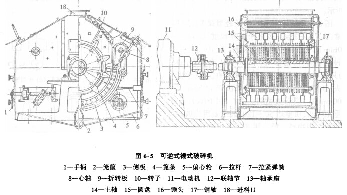 圖6-5是可逆式錘式破碎機的結構。這種破碎機的應用范圍與不可逆式錘式破碎機相同。但是,由于它的轉子10可以正、反兩方向旋轉,所以它的主要零、部件都是對稱市置的,給料口18也就必須設置在機器的正中上方。