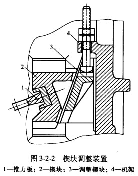 (2)楔塊調(diào)整。借助后推力板支座與機(jī)架后壁之間的兩個(gè)楔塊的相對(duì)移動(dòng)來(lái)實(shí)現(xiàn)破碎機(jī)排礦口的調(diào)整(圖3-2-2)。轉(zhuǎn)動(dòng)螺栓上的螺帽,使調(diào)整楔塊3沿著機(jī)架4的后壁做上升或下降移動(dòng),帶動(dòng)前楔塊2向前或向后移動(dòng);從而推動(dòng)報(bào)力板或動(dòng)領(lǐng),以達(dá)到排礦口調(diào)整的目的。此法可以達(dá)到無(wú)級(jí)調(diào)整,調(diào)整方便,節(jié)省時(shí)間,不必停車調(diào)整,但增加了機(jī)器的尺寸和質(zhì)量。中、小型額式破碎機(jī)常常采用這種調(diào)整裝置。