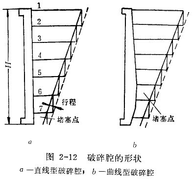 破碎腔的形狀有直線型和曲線型兩種。若兩種破碎腔的給礦口寬度、排礦口寬度、動顎的擺動行程和擺動次數均相同時,礦石在破碎腔內的流動狀態如圖2-12所示。圖中實線表示顎板閉合時的位置,虛線表示顎板后退最遠時的位置。