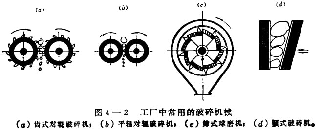 在工廠中常用的破碎機有;齒式對輥破碎機,如圖4-2(a),兩個表面帶齒的輥子相對轉動,牙齒不斷作用于料塊上,使料塊破碎;平輥對輥破碎機,如圖4-2(b),兩個相對旋轉的平滑圓輥不斷地壓在科塊上,將科塊壓碎;帶篩網式球磨機(篩式球磨機),如圖4-2(c),在回轉的筒體內借鋼球的撞擊力和研磨作用,使料塊破碎;顎式破碎機,如圖4-2(d),通過擺動的顎板對料塊施加周期性的壓力,將料塊破碎。