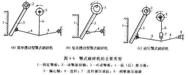 根據可動顎板的運動特性分為簡單擺動型與復式擺動型兩種。近年來,液壓技術在破碎設備上得到應用,出現了液壓顎式破碎機。圖4-4所示為顎式破碎機的主要類型。