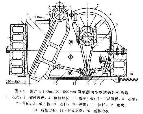圖4-5所示為國產2100mm×1500mm簡單擺動型顎式破碎機構造。該機由機架、工作機構、傳動機構、保險裝置等部分組成。其下固定顎和動顎構成破碎腔。送入破碎腔中的廢料由于動顎被轉動的偏心軸帶動呈往復擺動而被擠壓、破裂和彎曲破碎。當動顎離開固定顎時,破碎腔內下部己破碎到小于排料口的物料靠其自身重力從排料口排出,位于破碎腔上部的尚未充分壓碎的料塊當下落一定距離,在動顎板的繼續壓碎下被破碎。