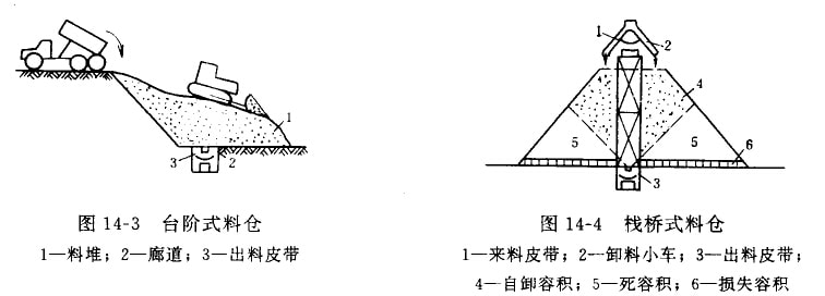 (2)棧橋式料倉。圖14—4所示,地面亡架設棧橋.棧橋頂部安裝有皮帶機,經卸料小車向兩側卸料。料堆里長條形,中廊道內的皮帶價出料。這種利用棧橋堆料的方式,可以增大堆料高度(可達9一15m),減少料堆占地面積。但骨科跌落高度大,易造成遜徑和分離,間且料堆自卸容積(位十骨料自然休止泊斜線中間的容積)小。