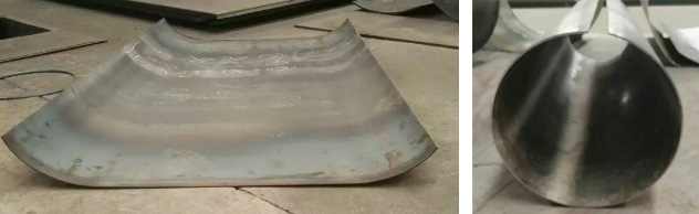 此方法在NHX500選粉機制作中得到檢驗,收到良好效果,預彎成品如圖1、圖2。對于日常制作過程中較薄板的卷圓件可采用此方法(3~6mm),既能節約材料,又能提高效率,保證質量。