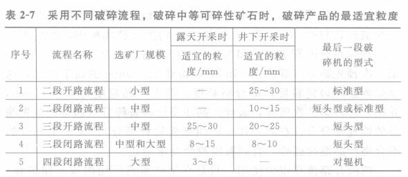 最終碎礦粒度的大小和選礦廠的規(guī)模有很大的關(guān)系,見(jiàn)表2-6 所列。