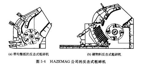 HAZEMAG公司開發了硬物料的反擊式粗碎機。這種破碎機的工作件都以耐磨性很高的高鉻合金制造,其硬度高達HRC60以上,并有一定的沖擊韌性。在結構上也注重工作金屬的充分利用。型號APPKM1615的破碎機的最大進料粒度為0.8m,出料粒度<56mm的占90%,破碎玄武石的生產能力可達350t/h。